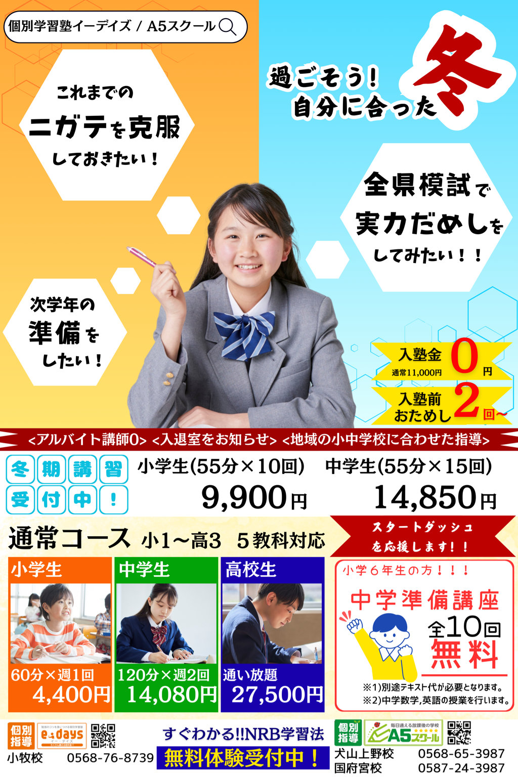 冬期講習+全県模試で“できる”を実感!小6の皆さんへ、中学準備講座(全10回)を無料でご提供中! 集中講座で自信をつける夏。今なら入塾初回特典あり。申込はお早めに! 新年度生徒募集中!今なら入塾金0円!転塾大歓迎!春期講習生も大募集! 新年度生徒募集中!今なら入塾金無料!さら入塾特典も! この春がはじめ時!全国模試トライアル実施中!「今なら入塾金0円!入塾初回特典あり!」春期講習性も募集中! 冬期講習募集開始!今なら入塾金0円!!入塾初回特典あり!!! 「超本気の夏」塾生募集!夏期講習開催!!今なら入塾初回特典あり!!! 新年度生徒募集中!今なら入塾金無料!さらにコース特典も! 冬期講習受付中!今なら入塾者全員に通常授業10回分プレゼント!さらに小学6年生には中学準備講座10回分をプレゼント! ※中学準備講座の受付期間については、各校舎にて予めご確認下さい。 テスト対策もバッチリ!秋の入塾応援キャンペーン実施中! 投稿ナビゲーション ← 以前の投稿